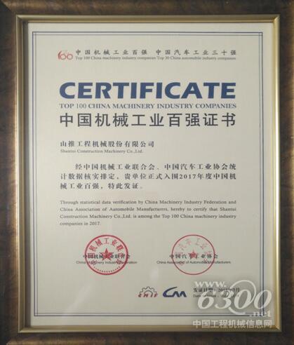 2018年7月14日,由中国机械工业联合会、中国汽车工业协会主办的第十四届“中国机械工业百强、汽车工业三十强企业信息发布会”在山东临沂市召开。会上发布了2017年中国机械工业百强企业名单,山推工程机械股份有限公司以全年稳健上升的经营业绩,居第49位,比2016年上升6位。