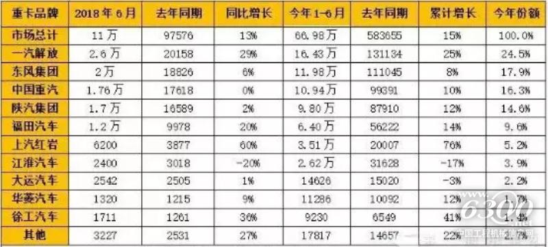 2018年上半年重卡市场企业销量一览表(单位:辆)