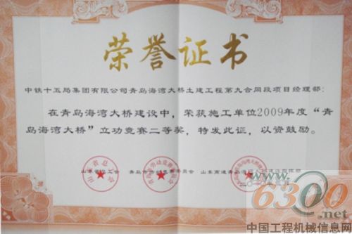 日前,中国铁建中铁十五局集团南京公司青岛海湾大桥第九合同段项目部,在青岛海湾大桥工程施工单位综合考核评比中,被山东省总工会、青岛市劳动竞赛委员会、山东高速青岛海湾大桥建设指挥部评为2009年度“青岛海湾大桥杯”立功竞赛二等奖。