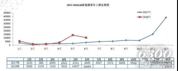 统计数据显示, 2018年6月份客车上牌10449辆,其中纯电动客车9398辆,虽然受政策影响环比下降24.26%,但同比去年还是大涨208.94%,插电式混合动力客车1011辆,环比下降35.4%,同比增长67.66%,另有燃料电池客车40辆。