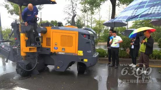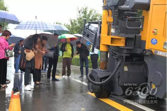 虽然秋风飒飒、秋雨簌簌,但各位嘉宾都撑着雨伞认真观看了演示。表演的主角儿依旧是XM503铣刨机,这次的施工对象是改性沥青混合料路面,路面的硬度和粘度大大超过普通沥青混合料。