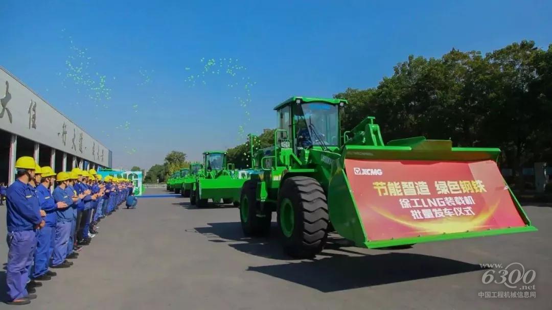 2018年10月10日,在徐工大吨位装载机智能化制造基地生发出一片葱郁的绿色钢铁森林,百余台徐工LNG装载机批量发车仪式在此隆重举行。