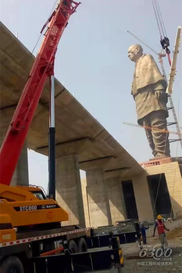 项目施工中,"三一印度"共部署了8台起重设备,其中现场全部的7台汽车起重机均由"三一印度"本地生产,共完成了80%左右的吊装工程量,包括建筑材料的装载和搬运、前花园结构和雕像主体结构的施工等。