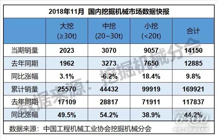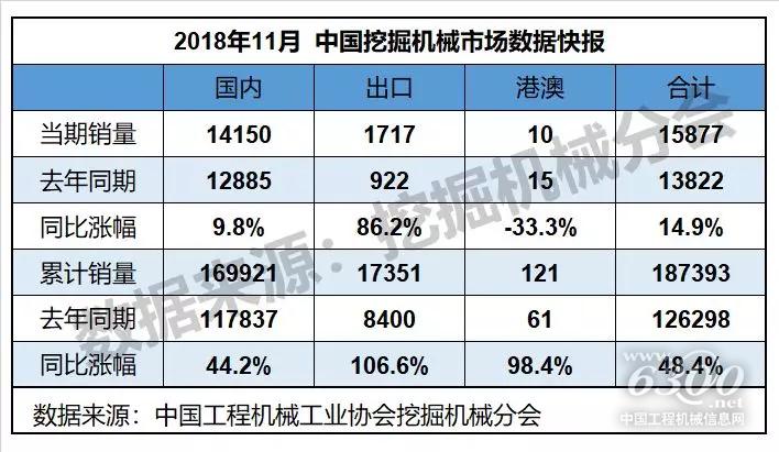 根据中国工程机械工业协会挖掘机械分会行业统计数据,2018年1—11月纳入统计的25家主机制造企业,共计销售各类挖掘机械产品187393台,同比涨幅48.4%。国内市场销量(统计范畴不含港澳台)169921台,同比涨幅44.2%。出口销量17351台,同比涨幅106.6%。