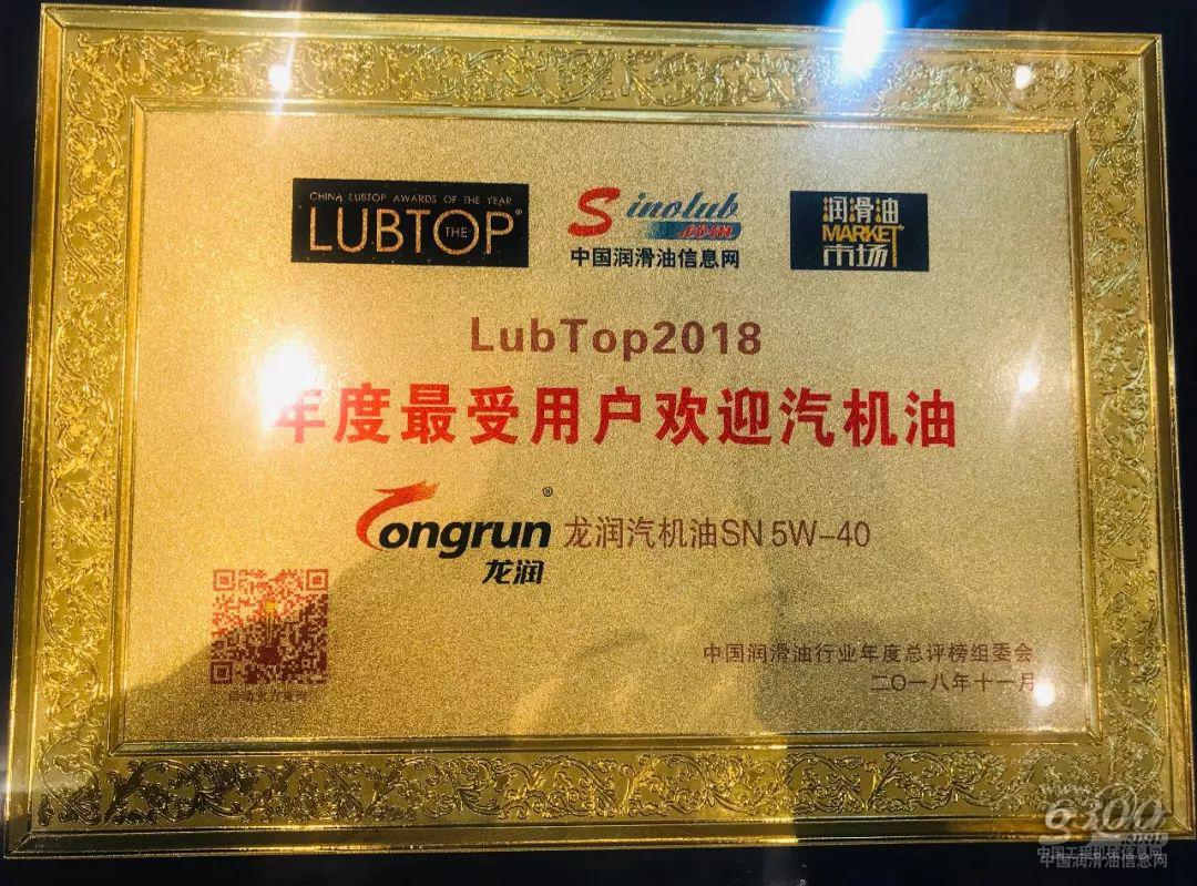 龙润润滑油荣获“LubTop2018最受用户欢迎汽机油”