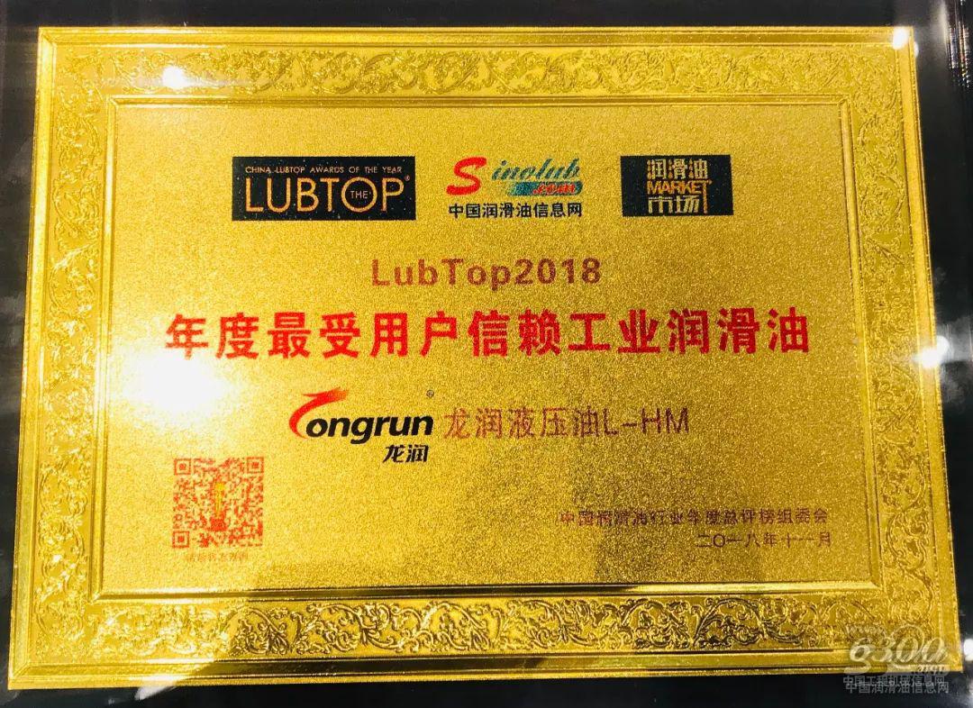 龙润润滑油荣获“LubTop2018最受用户信赖工业油”
