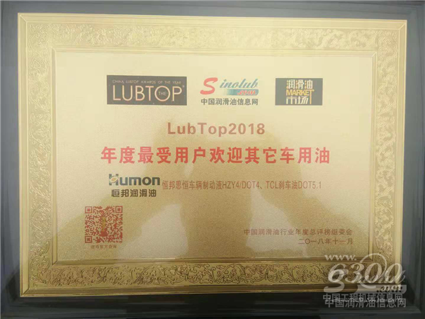 近日,被称为润滑油行业“奥斯卡”的“LubTop中国润滑油行业年度总评榜”颁奖盛典在上海举行,烟台恒邦化工有限公司旗下恒邦润滑油车辆制动液HZY4/DOT4和TCL刹车油DOT5.1两款产品荣获本届“中国润滑油行业年度最受用户欢迎其他车用油奖”。