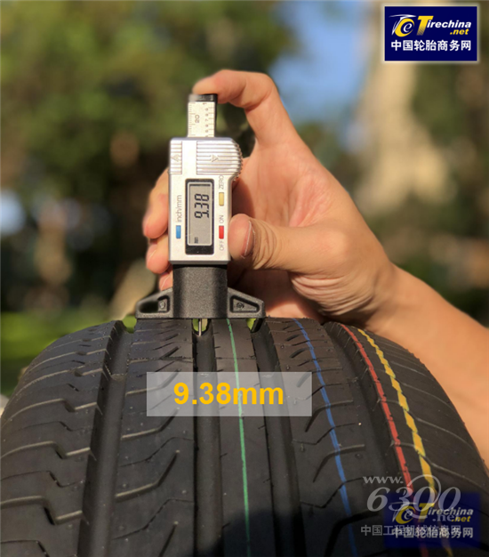 上面说这款胎纵向沟槽外观深邃,那到底有多深?一测发现,中间排水沟深度达到了9.38mm,加大湿地排水量保证足够的摩擦力,同时花纹沟的加深还能增加磨损体积,达到更长使用寿命。