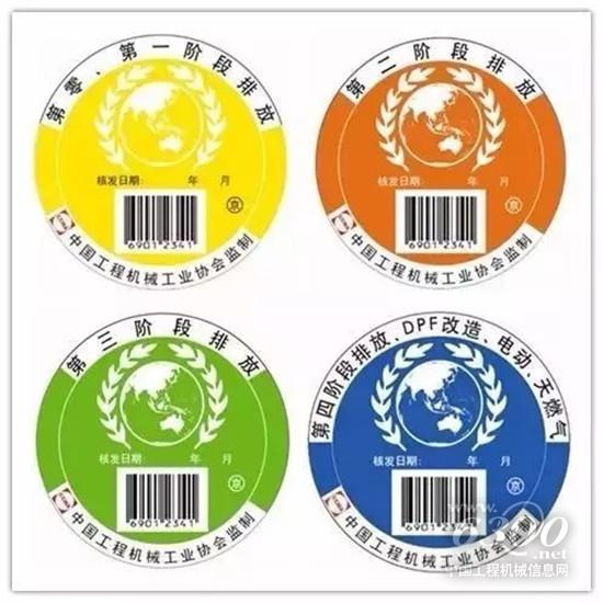 按照有关要求,中国工程机械工业协会统一制定非道路移动工程机械标识:“第零、第一阶段排放”标识为黄色;“第二阶段排放”标识为橙色;“第三阶段排放”标识为绿色;“第四阶段排放、DPF改造、电动、天燃气”的标识为蓝色。