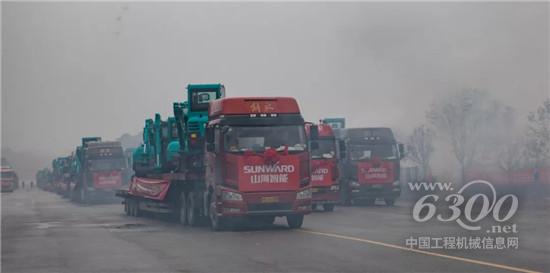 在一片热烈的掌声中,何清华董事长宣布发车!满载山河智能设备的100多辆运输车,浩浩荡荡地驶出公司大门,它们将奔赴全球,投身于各地的重点工程中,开启各自的价值创造之旅。