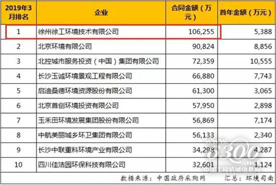 据环境司南参照中国政府采购网采购公告的快讯报道,2019年3月份,受到固定资产投资、政策更新、城市化进程加快等利好的提振,国内环卫运营市场中标数量同比增长20.77%徐工环境产业拔得头筹,先后中标闽清县城乡环卫一体化PPP项目(乡镇标段)和鹤岗市东山区环卫服务项目,以10.63亿元的合同业绩登上当月冠军宝座