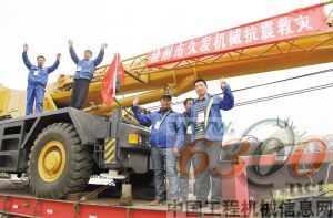 昨天上午,两辆载重大板货车缓缓驶进位于大彭镇311国道边的徐州久发工程机械有限公司院内,两辆整装待发的30吨崭新越野轮胎吊车即将装车远行,他们的目的地是刚刚发生地震的青海省玉树县地震区。和吊车同行的,还有久发工程机械有限公司的五位专业技术人员。这五位徐州人和两辆吊车将按照西宁市红十字会的统一调配,开赴抗震第一线,传递有情有义徐州人对震区群众的贴心支持。