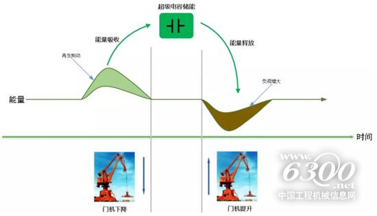 中车四方所基于储能系统的门座起重机功率补偿装置利用先进的超级电容技术,将门机起重机构下放货物时产生的能量快速回收,并将这部分能量在起升货物时快速释放出去,高效节能系统就在货物的“一抓一放”之间完成能量的回收和再利用,以达到节能的目的。