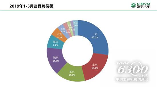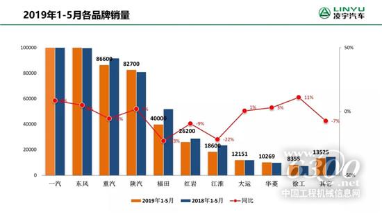 东风进一步稳固了亚军的行业地位。5月份,东风重卡销售2.2万辆,同比增长2%;今年1-5月,东风重卡累计销售10.49万辆,同比增长5%,市场占有率提高到19%,稳居行业第二。