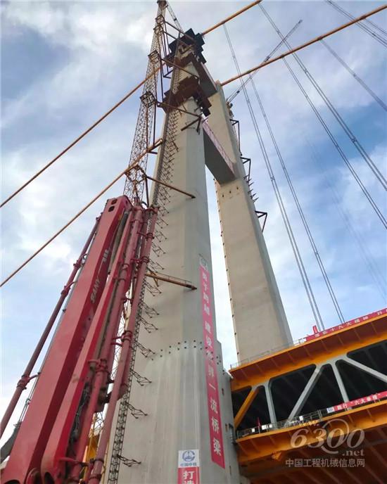 桥段塔柱的混凝土泵送是大桥施工中的难点。为此,三一研发人员为大桥量身订做了2台出口压力为35兆帕的超高压拖泵。施工中,三一“泵王”一次性泵送高度达到了240米,顺利完成了主桥墩的泵送任务。