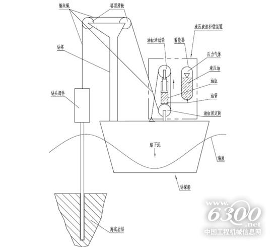 反之,当钻探船因海浪的影响向上浮时,钻塔及塔顶滑轮也会向上运动,钢丝绳被绷紧,因为钻头部件有足够的重量,油缸上端的油缸活动轮会在钻头部件重量的作用下向下运行,将油缸无杆腔中的液压油通过油管压入蓄能器。
