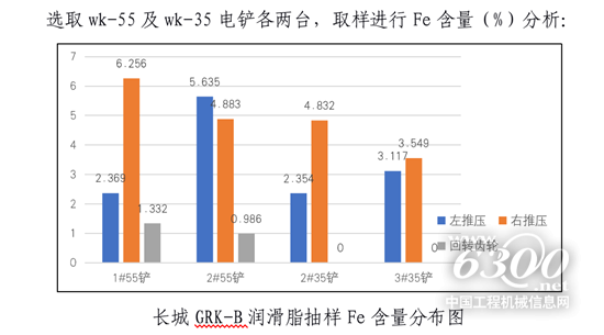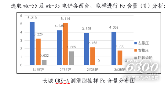 经过齿面润滑状况及Fe含量分析,可以看出:润滑脂在齿面分布均匀,粘附性满足应用要求,齿轮表面未见异常变化;应用以来,润滑脂的泵送性能满足要求;从金属含量监测并结合齿面变化情况来看,产品的极压抗磨性能、润滑性能满足要求;从使用效果来看,长城GRK-A、GRK-B系列润滑脂可以满足wk-20、wk-35、wk-55电铲的苛刻润滑要求,达到原用进口产品水平。