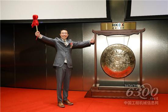 李贵平在香港交易所上市委员会代表陪同下敲打铜锣以示开市