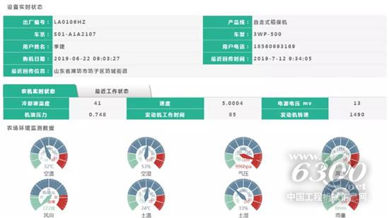 与此同时,农业装备作业的全过程可以通过全国农机大数据中心的显示屏上进行实时观看。在显示屏的左侧显示的是作业场景的实时画面,在屏幕右侧则显示的是作业车辆和农机具远程传回来的实时数据,其中包括发动机转速、油压、水温、作业速度等车辆数据以及作业面积、作业轨迹等作业数据,并对车辆及作业异常情况进行预警,用户可以随时随地通过手机或电脑掌握车辆的工作状态。