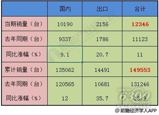 2019年7月,共计销售各类挖掘机械产品12346台,同比涨幅11.0%。国内市场销量10190台,同比涨幅9.1%。出口销量2156台,同比涨幅20.7%。