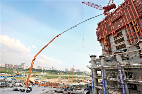 中联重科全球最长101米碳纤维臂架泵车在武汉中心施工建设