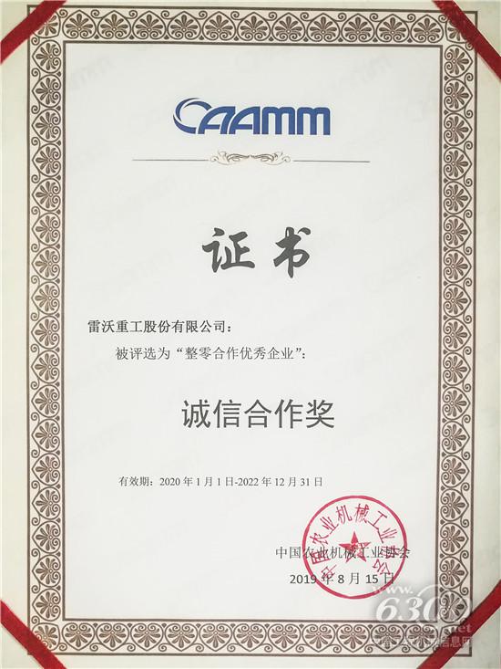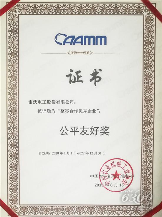 2019年8月14日-16日,由中国农业机械工业协会主办的“2019中国农业机械与零部件行业峰会”在江苏省无锡市举行,来自农机主机及零部件企业、科研院所、高等院校、金融机构、新闻媒体代表等260余人参加会议。会上雷沃阿波斯一连斩获“诚信合作奖”“公平友好奖”“阳光采购奖”三大奖项,得到行业、合作伙伴和用户的高度认可,成为本次会议获奖最多的企业。