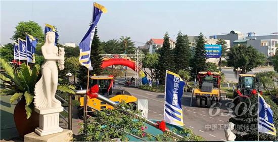 在越南高举着的徐工集团旗帜与市场销量冠军轮胎压路机交相辉映