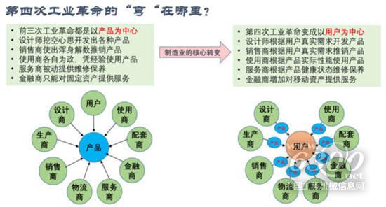 这里边,我们就上升到理论,也就是说从大批量生产转成个性化生产,这时生产力和生产关系关系,就从买卖关系变成服务关系。生产力和生产关系是一对“矛盾”,前三次工业革命重点是强调提高生产力,生产关系没变。第四次工业革命强调不是生产力,是改变我们的生产关系,也就是说以前买卖关系变成服务关系。既然这个关系一变,考虑问题的角度,解决问题的方法也就全然不同了。