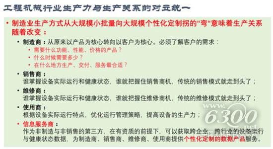 工程机械生产力和生产关系我是这么理解的:生产关系变了,不是尽量扩大产能,降低生产成本,到市场上圈更大的地,而是变成要知道用户需要什么,尽量的满足,给用户更好的产品。