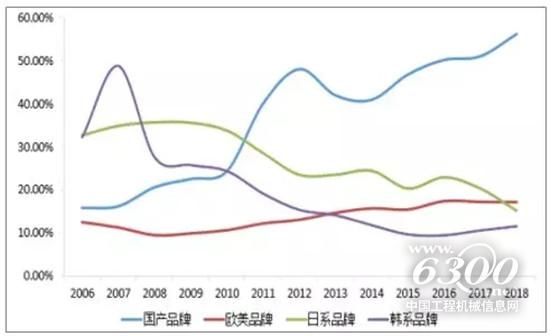 中国挖掘机市场集中度经历了从高度集中到逐渐分散到再集中的过程。2012年是市场集中度最低的一年,CR3=29%,CR5=43%。2017年CR3=44%,CR5=59%,行业前五为三一重工(22.26%)、卡特彼勒(13.17%)、徐挖(9.02%)、斗山(7.63%)、小松(6.83%)。2018年,CR3达到47%,CR5达到62%,行业前五为三一重工(23.07%)、卡特彼勒(13.01%)、徐挖(11.51%)、斗山(7.96%)、小松(5.03%)。