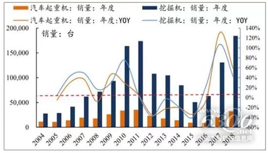 挖机和起重机的应用场景重合度非常高。2018年挖机和汽车起重机销量分别为18.4万台和3.2万台,挖机销量超过历史高点。