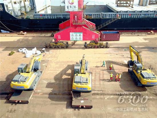 装载机、挖掘机、矿用自卸车等,随着吊装作业的开始,一台台徐工“重器”被依次装载至大型远洋巨轮上,整个装货时间仅用时43个小时。