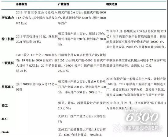 从销售规模的角度看,浙江鼎力2019年前三季度公司总收入14.5亿收入,其中国内市场收入8.2亿元;湖南星邦2018年收入达到了1.15亿美金,合计8.1亿人民币,2019年星邦剪叉式销量预计近万台,预计全年收入规模同比50%以上大幅增长,超过12亿人民币;徐工年剪叉销量预计超越6000台以上,臂式产品销量超越1500台,全年收入目标向10亿进军;行业新进入者中联重科在2019年10月底的上海高空机械展上展出四个系列21型剪叉,两个系列4型臂架的产品阵容,预计2019年全年将录得7亿以上的销售总量。