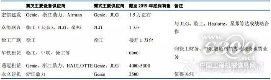 在排名前三的租赁公司中,宏信建发在2018年保有量成功破万台,预计截至2019年底保有量在1.5万台左右;众能联合在2019年设备保有量破万台;徐工广联在2018年底租赁规模达7000台,预计至2019年年底整个保有量规模接近万台。而浙江大黄蜂的母公司华铁应急,进入行业半年左右时间内,机队规模已达到近8000台,并已经布局40多个网点,很快将向万台保有量进军。除了表中的这几家租赁商之外,永立建机于2019年正式进入高空平台市场,仅仅到8月份就完成了布局全国的六大基地开业,采购了500台吉尼臂架、2000台鼎力剪叉,大有来势汹汹之意。