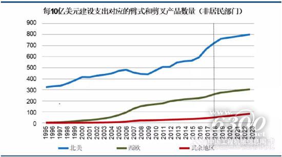 根据联合租赁提供的数据,2018年全球每10亿美金建筑支出对应的高空作业平台租赁数量为138台;而在西欧非居民市场,每10亿美元建设支出对应的AWP产品数量超过250台;北美地区更远高于两者,超过700台。