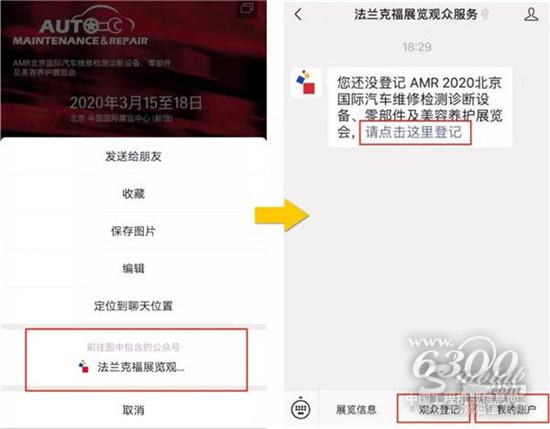 1、关注展会官方微信公众号【AMR北京国际汽保汽配展】,点击微信菜单栏【展会服务】、【我要观展】即可进入观众预登记界面。