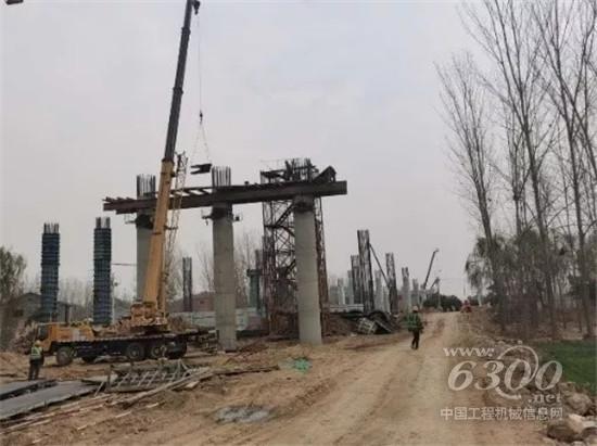 在山东省济宁市梁山县范台梁高速,6台K系列25吨齐心协力进行桥梁桩基及桥板吊装。