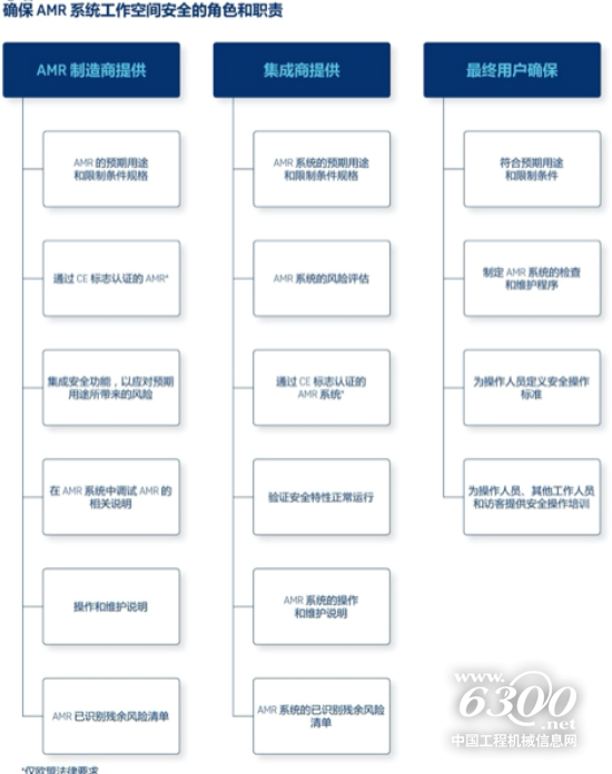 AMR制造商主要承担安装阶段的调试、技术培训、指导,以及对AMR的产品设计及质量保证证明。进入安装阶段后,AMR系统集成商(如果用户选择自行集成机器人,则可能是最终用户)负责安装,提供充足的操作信息,识别或解决所有风险,预测潜在隐患;对机器人进行编程,使其能够遵守安全标准,并在安装过程中对AMR系统进行风险评估。部署AMR系统之后,终端用户将负责制定并遵循AMR系统的操作和维护程序。最终用户应规范安全操作程序,并向操作人员、其他工作人员和访客提供安全操作培训。