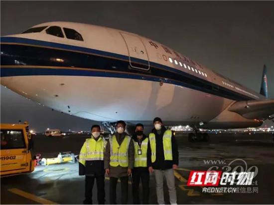 莫斯科当地时间2月1日晚,中国南航在莫斯科机场装载口罩运回湖南。