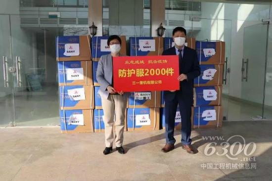 2月12日,下午15:20分,在昆山市应急储备中心,三一重机有限公司向昆山市人民政府捐献出由海外采购的2000套杜邦医用型防护服,董事长俞宏福先生将这批防疫物资正式交接给昆山市发改委主任秦珊珊女士。