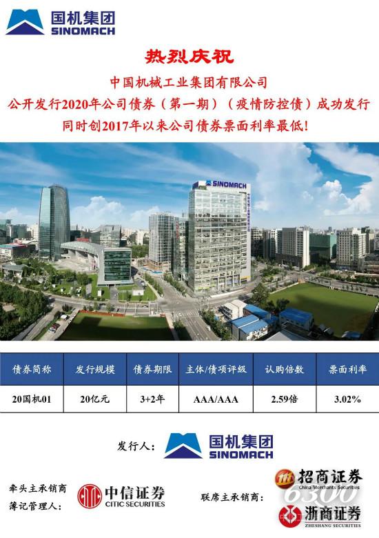 为进一步支持抗击疫情、保障企业发展,国机集团抓住有利市场时机,于2月28日在上海证券交易所市场成功簿记发行中国机械工业集团有限公司公开发行2020年公司债券(第一期)(疫情防控债),发行规模20亿元,部分募集资金将用于各类防疫生产投入,保障企业积极响应疫情防控工作,彰显国机集团作为“国家保障队”的央企担当。