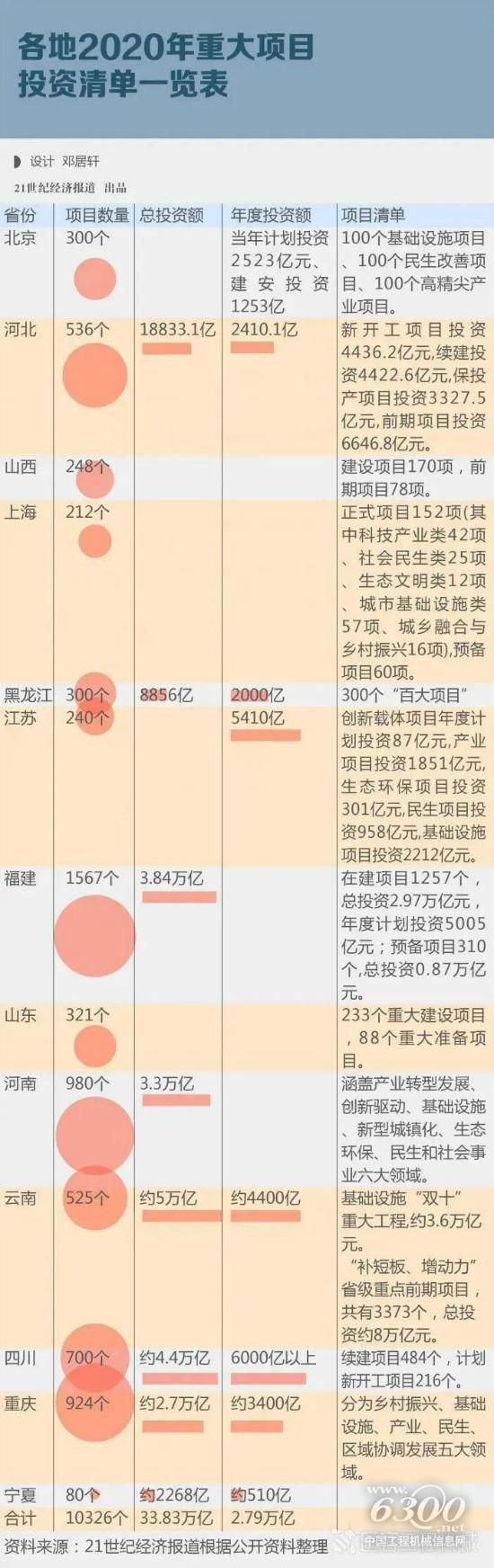 据统计,截至3月1日,包括北京、河北、山西、上海、黑龙江、江苏、福建、山东、河南、云南、四川、重庆、宁夏等13个省市区发布了2020年重点项目投资计划清单。这份投资清单共包括10326个项目,其中8个省份公布了计划总投资额,共计33.83万亿元;另有8个省份公布了年度投资额,合计约2.79万亿元。