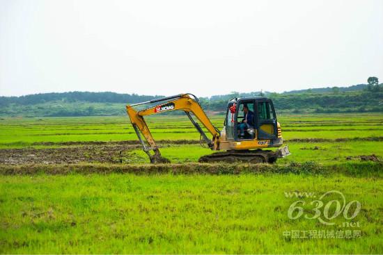 在江西省奉兴县,绿油油的田地和欢快水鸟在山的映衬下形成了一幅美丽的风景画,画面中一台徐工XE60DA正在进行农田翻土作业,保证春耕的顺利进行。刚下过雨的泥塘,徐工XE60DA如履平地,灵活的旋转、果断的下铲、利索地卸料,一套优美又利落的动作让这片土地焕发了生机。