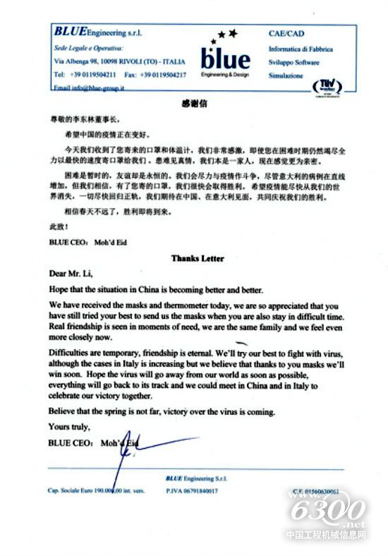 “困难是暂时的,友谊却是永恒的。”Moh’d Eid在信中向中车株洲所表示,尽管意大利的病例在直线增加,但我们相信,有了你们捐赠的口罩,我们会很快取得胜利,希望疫情能尽快从我们的世界消失,一切尽快回归正轨,我们期待在中国、意大利见面,共同庆祝我们的胜利。
