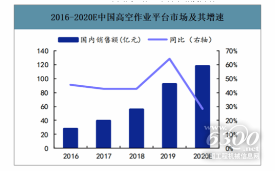 中国高空作业平台市场近年来高速增长,高空作业平台销量增速达到45%左右,成为工程机械行业中成长性最高的子行业。2018年末,我国高空作业平台行业市场规模约为56亿元,2019年末国内高空作业平台租销售额达92亿左右,同比增长42.9%,2020年有望达到115亿元。