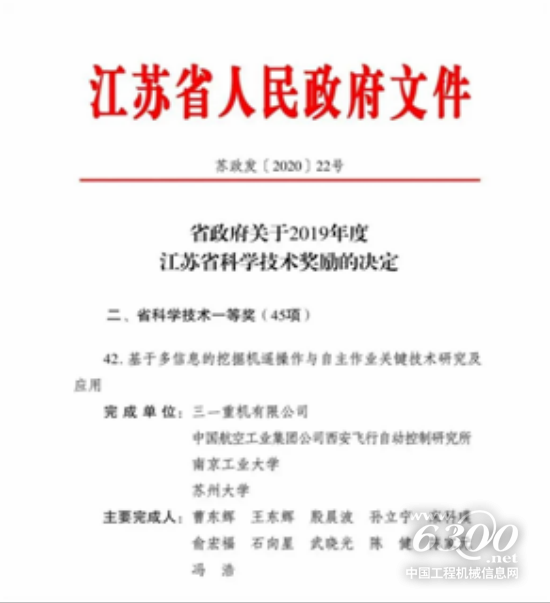 近日,江苏省人民政府发布《关于2019年度江苏省科学技术奖励的决定》,由三一重机有限公司牵头实施的“基于多信息的挖掘机遥操作与自主作业关键技术研究及应用 ”项目获得省科学技术一等奖!这是江苏省科学技术奖设立以来,昆山企事单位牵头实施的科技创新项目首次荣获一等奖荣誉,也是苏州市范围此次唯一获得一等奖的企业类项目。