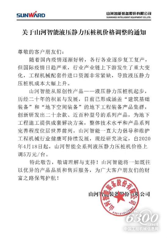 近日,山河智能装备股份有限公司发布《关于山河智能液压静力压桩机价格调整的通知》,自2020年4月18日起,山河智能全系列液压静力压桩机价格上调5万元/台。