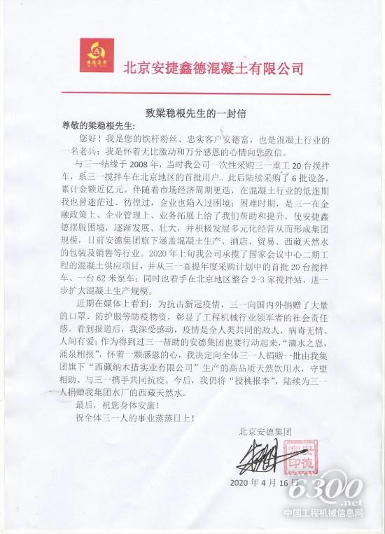 随着防疫物资的投入使用及关怀政策的落地实施,三一也收到了来自社会各界发来的感谢信。“三一捐赠了大量口罩、防护服等物资,彰显了行业领军者的社会责任感。”这是北京安德集团董事长安德富先生在感谢信中的一席话,也是对三一在抗疫行动中付出努力的肯定。