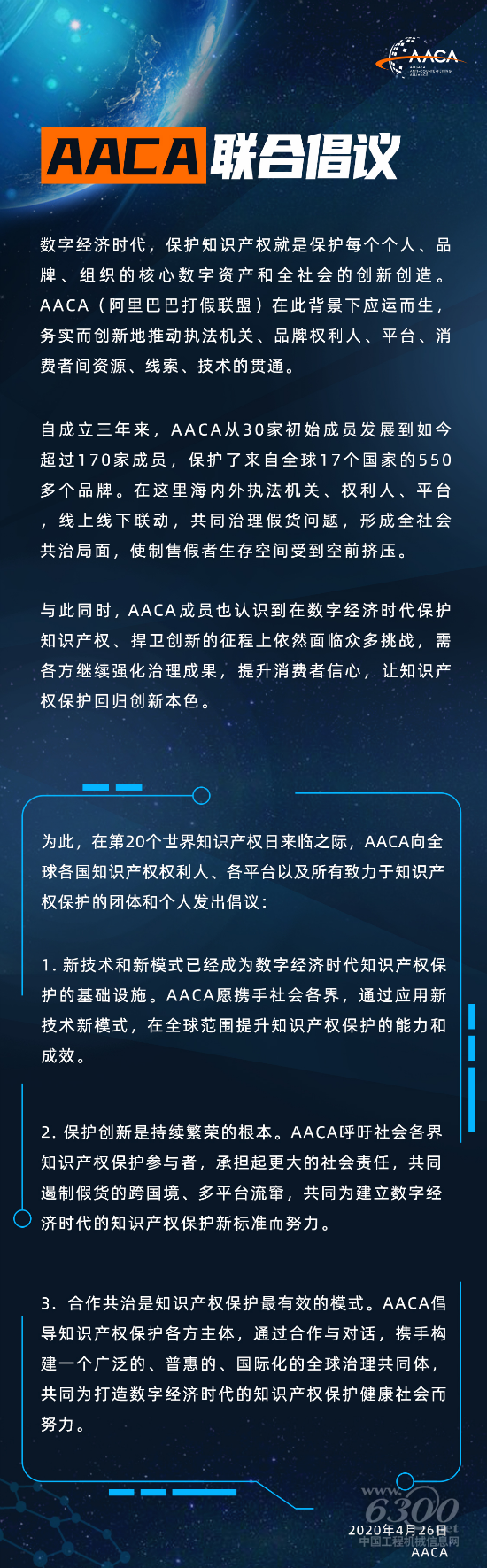 2020年4月26日是第20个世界知识产权日,康明斯联手阿里巴巴打假联盟(AACA)发出联合倡议,让我们一起通过合作与对话,携手构建一个广泛的、普惠的、国际化的全球治理共同体,共同为打造数字经济时代的知识产权、保护健康社会而努力!