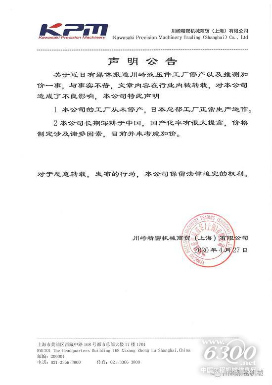 川崎精密机械发布声明:工厂未停产、产品不加价!